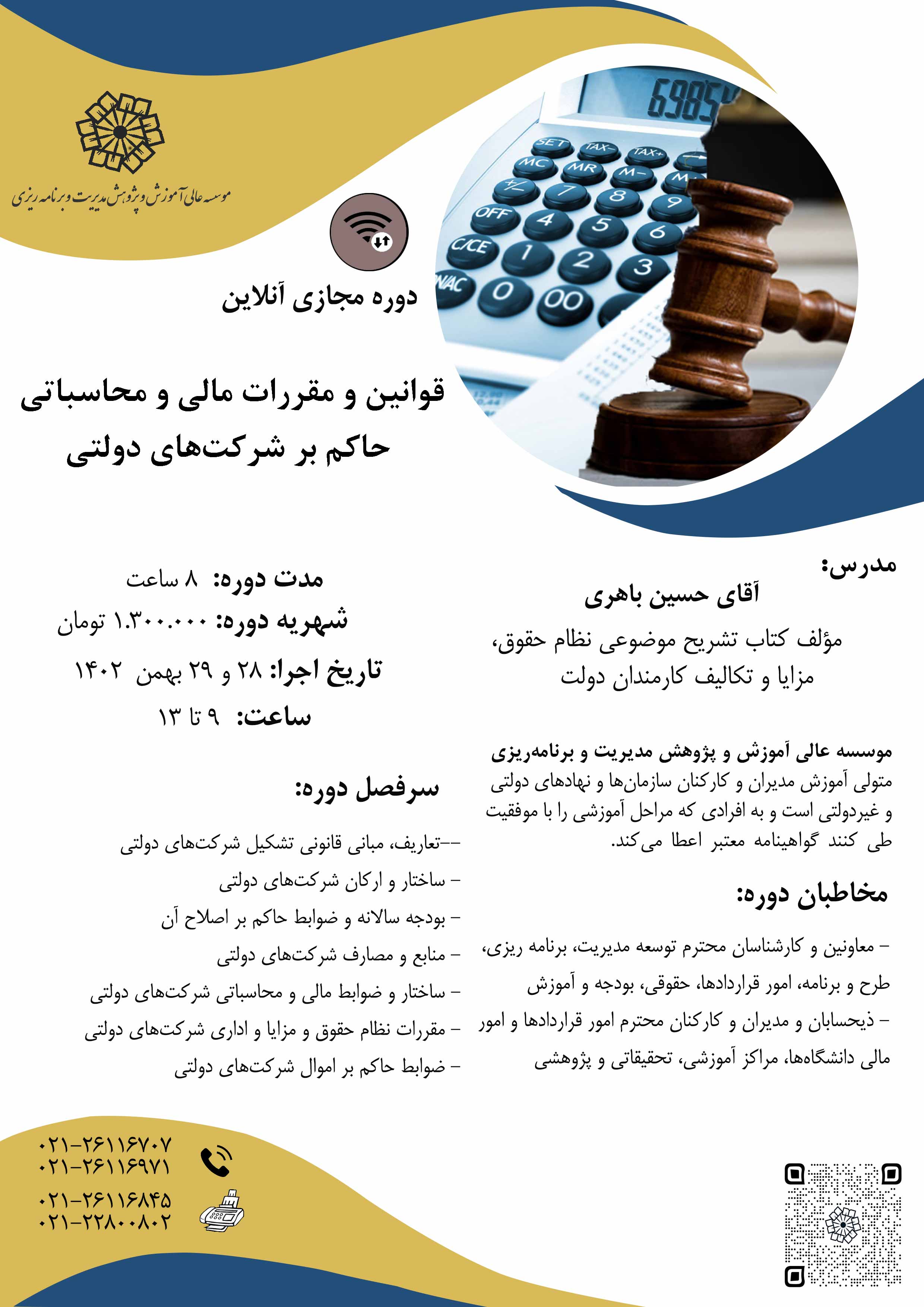 دوره آموزشی مجازی "قوانین و مقررات مالی و محاسباتی حاکم بر شرکتهای دولتی" بیست و هشتم و بیست و نهم بهمن برگزار میشود