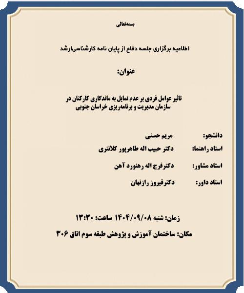 اطلاعیه دفاع خانم مریم حسنی - دانشجوی کارشناسیارشد مدیریتدولتی