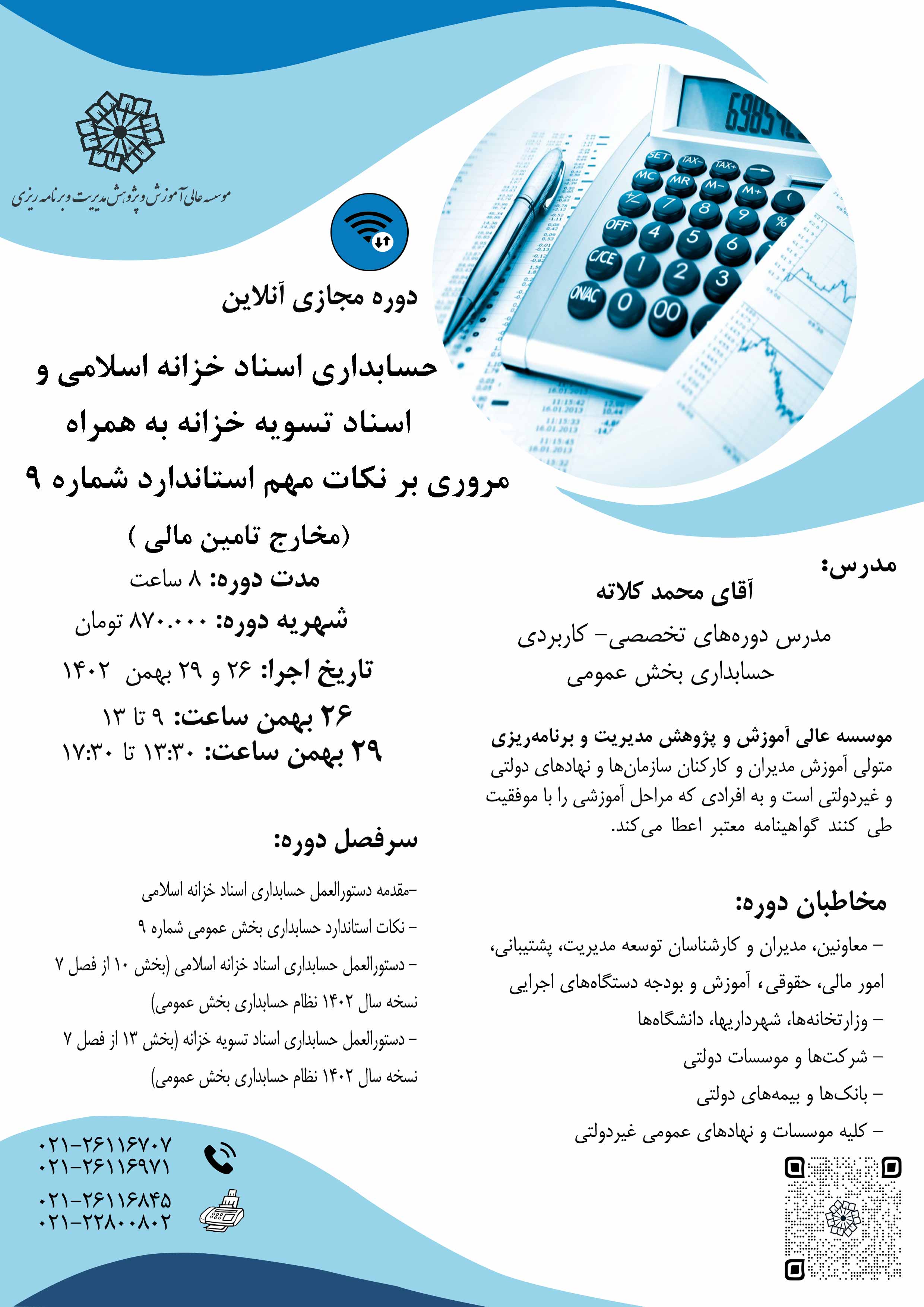 دوره آموزشی مجازی "حسابداری اسناد خزانه اسلامی و اسناد تسویه خزانه به همراه مروری بر نکات مهم استاندارد شماره 9 (مخارج تامین مالی)" بیست و ششم و بیست و نهم بهمن برگزار میشود