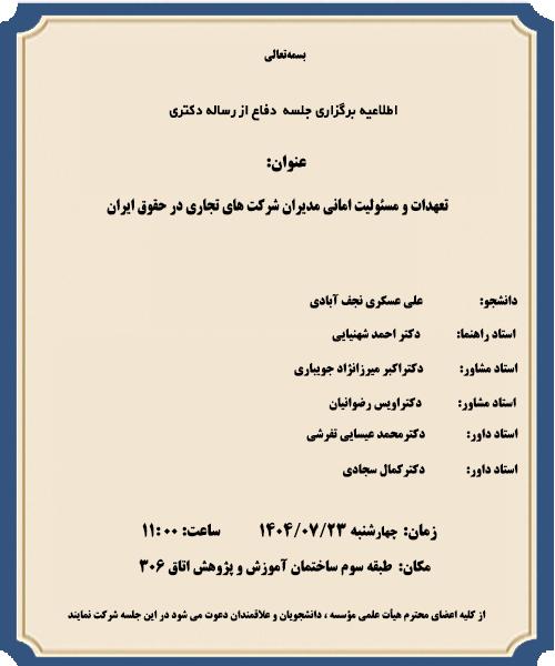 اطلاعیه دفاع آقای علی عسکری نجفآبادی - دانشجوی دکتری حقوق خصوصی